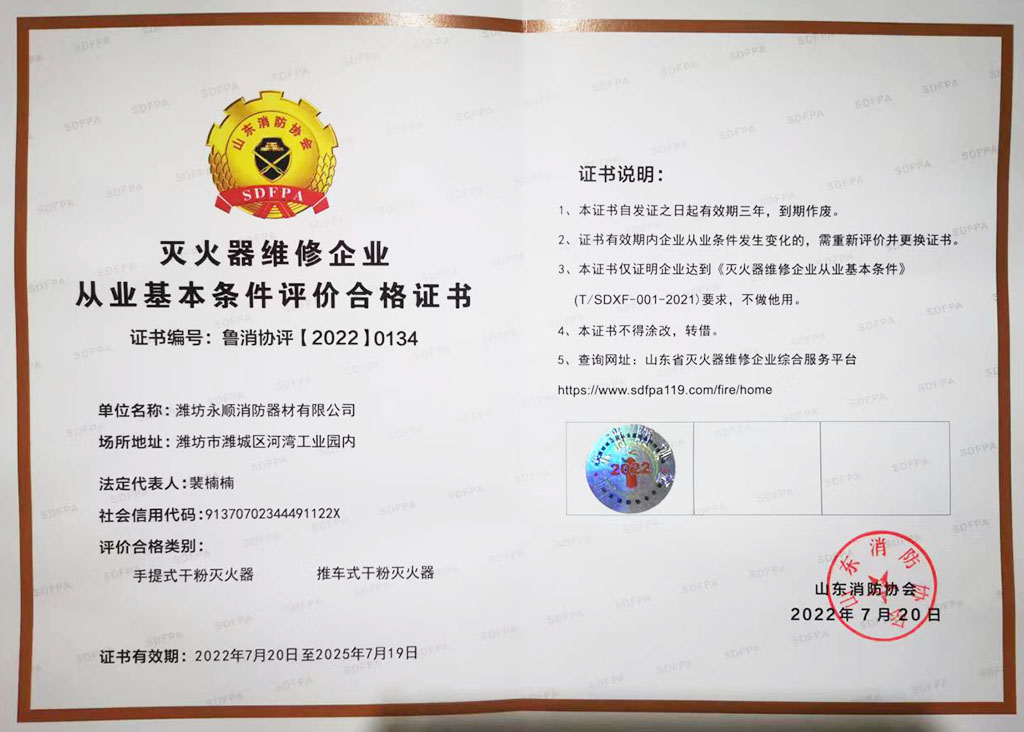 • 近日我公司獲得滅火器維修企業從業基本條件評價合格證書 近日我公司獲得滅火器維修企業從業基本條件評價合格證書